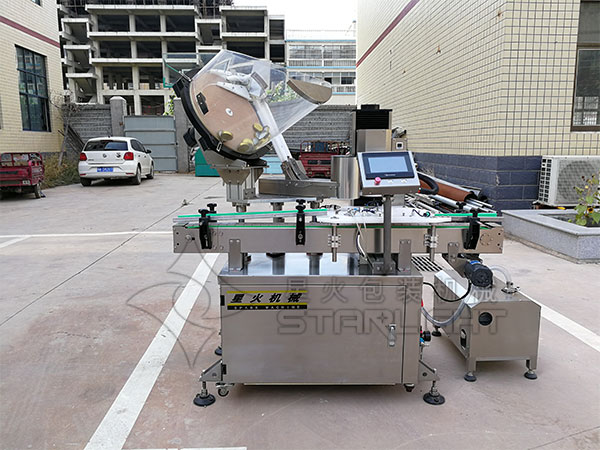 全自動真空旋蓋機(jī)主要用于液體充填后,旋蓋封口前將瓶內(nèi)空氣抽空,以增加產(chǎn)品的保質(zhì)期及產(chǎn)品的保鮮性。設(shè)計合理,適用規(guī)格多,自動化程度高,很多食品灌裝生產(chǎn)線都離不開旋蓋機(jī)的幫助,每一條灌裝生產(chǎn)線都是由灌裝機(jī)、旋蓋機(jī)兩大部分組成,有的流水線還有貼標(biāo)機(jī)、打碼機(jī)、噴碼機(jī)以及封箱打包機(jī)的協(xié)助。全自動真空旋蓋機(jī)使用非常廣泛,例如:可用于食品、蜂蜜、調(diào)味品及瓶裝食品等一系列真空包裝商品。星火機(jī)械這款全自動真空旋蓋機(jī)外觀美觀大方、靈巧、壓蓋速度快,合格率高,目前這款全自動真空旋蓋機(jī)已經(jīng)在行業(yè)中投入使用,客戶對此非常滿意,不管是設(shè)備的性能還是生產(chǎn)效率都非常不錯,全自動真空旋蓋機(jī)的出現(xiàn)使行業(yè)多了一份選擇,也豐富了商品市場。