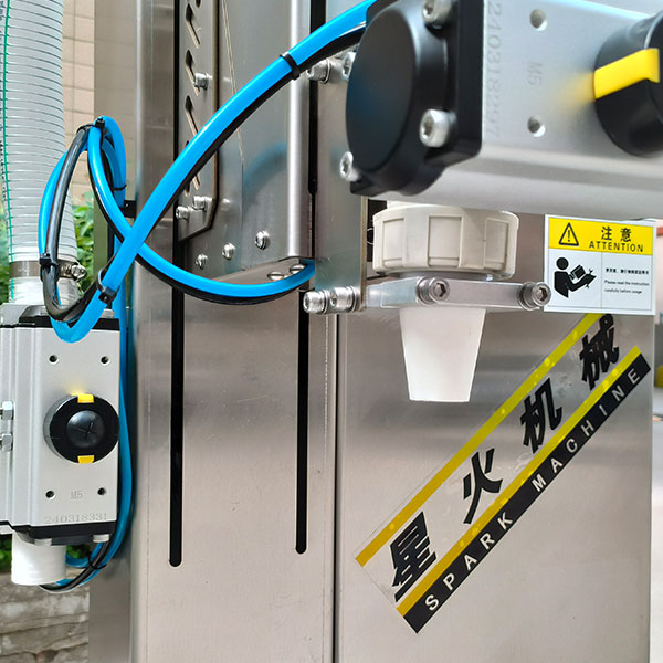 灌裝旋蓋一體機(jī)的工作模式是基于精準(zhǔn)的軟件控制運(yùn)作,具體的操作主要依靠于PLC可編程的信息攝入,將需要的旋蓋位置調(diào)整在合適容器桶的高度,并在微電腦顯示屏幕當(dāng)中設(shè)置好旋轉(zhuǎn)扭矩,按下大型單頭稱(chēng)重灌裝旋蓋機(jī)的啟動(dòng)鍵,灌裝旋蓋一體機(jī)輸送帶將空的容器桶輸送至灌裝工位,并將其定位,隨后稱(chēng)重感應(yīng)控制器自動(dòng)清零,灌裝頭下降至指定位置開(kāi)始對(duì)準(zhǔn)容器口進(jìn)行灌裝作業(yè),過(guò)程中稱(chēng)重系統(tǒng)將會(huì)實(shí)時(shí)檢測(cè)重量信息的變化,并將重量參數(shù)反饋給顯示屏,便于用戶(hù)查看,灌裝結(jié)束后,灌裝好的容器順著輸送帶被送至旋蓋工位,旋蓋頭將開(kāi)始根據(jù)容器自動(dòng)調(diào)節(jié)扭矩,經(jīng)過(guò)下壓旋轉(zhuǎn)完成密封旋蓋的動(dòng)作,整個(gè)運(yùn)作全部依賴(lài)于軟件配合設(shè)備來(lái)執(zhí)行。